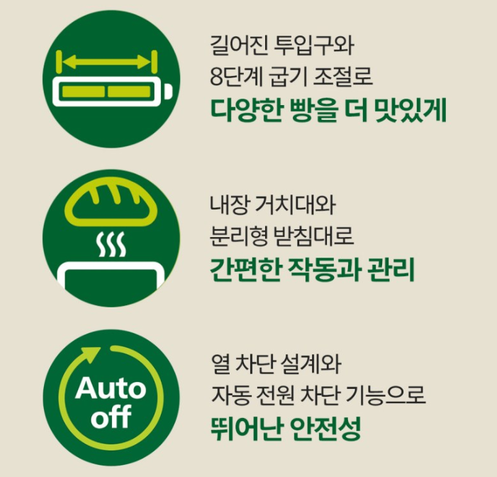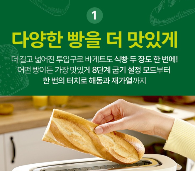 | ✔ 8단계 굽기 조절로 취향에 맞게 조리 | ❌ 와이드 슬롯이 아니라 두꺼운 빵은 안 들어갈 수 있음 |