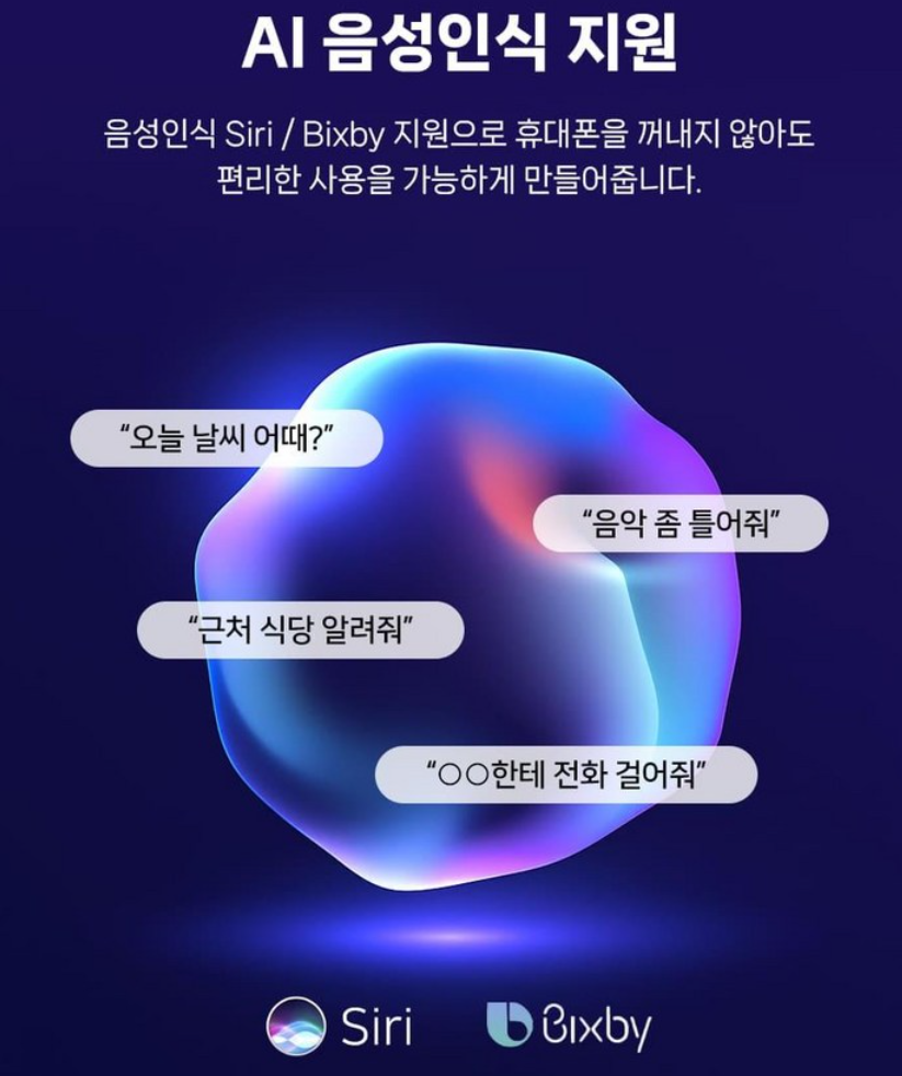Siri, Bixby 지원으로 “오늘 날씨 알려줘”, “음악 재생해줘” 등의 음성 명령도 가능. 부모님도 손쉽게 사용 가능!
