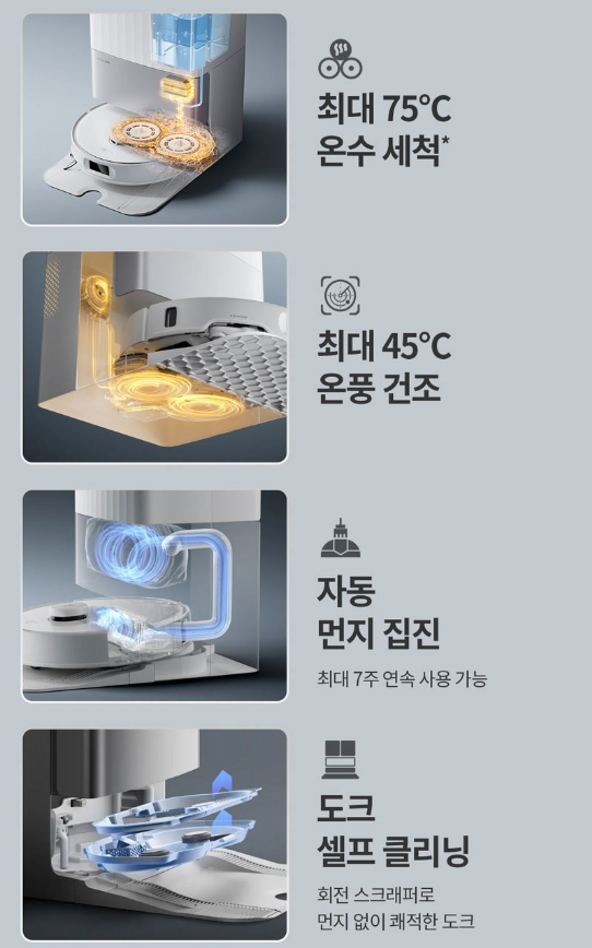 게다가 세척, 건조, 먼지 비움까지 자동화되어 손이 닿지 않아도 완성도 높은 청소가 가능합니다.